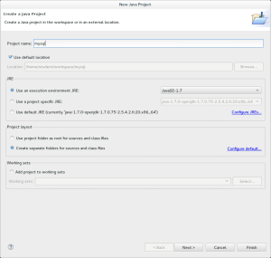 - The New Java Project dialog lets you enter a project name and it also gives you the ability to set some basic configuration details. As a rule, you simply enter the Project Name and accept the defaults before clicking the Finish button.