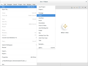 - Now you create a new Java class by navigating to the File menu options, then the New menu option, and finally choosing the Class floating menu.