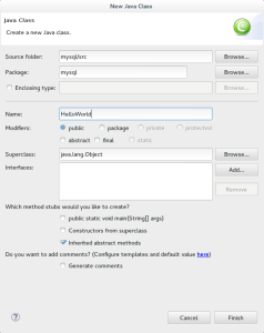 - The only difference in this copy of the New Java Class dialog is that I’ve entered HelloWorld as the Java Class’s name. Click the Finish button when you’re done.
